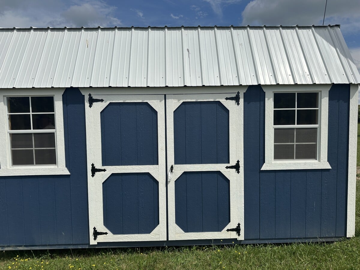 Building Specifications: Navy blue painted siding – White trim – Brilliant white metal roof – Smooth Floor